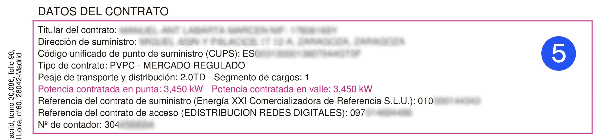 - Titular, documento de identidad y dirección de suministro: Son los datos del titular del contrato, así como la dirección del punto de suministro (la cual en muchos casos no coincide con la actual).