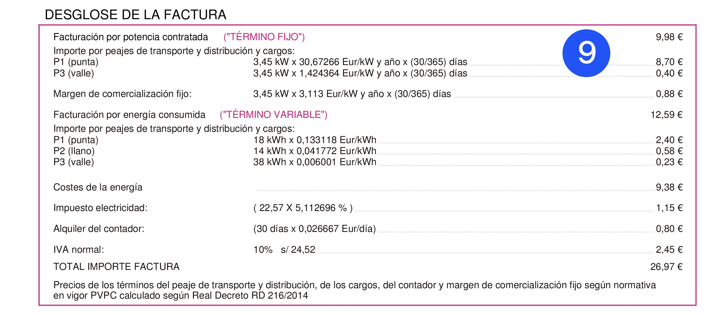 - Importe por peajes de transporte y distribución: se aplica tanto en el periodo punta como en el valle. Se calcula multiplicando la potencia contratada (kW) por el precio regulado del peaje de esa potencia (€/kW) y por el número de días de la factura. Es decir: Potencia contratada